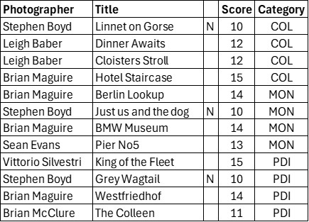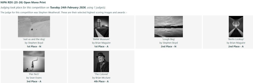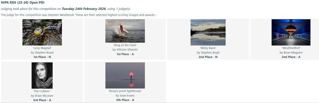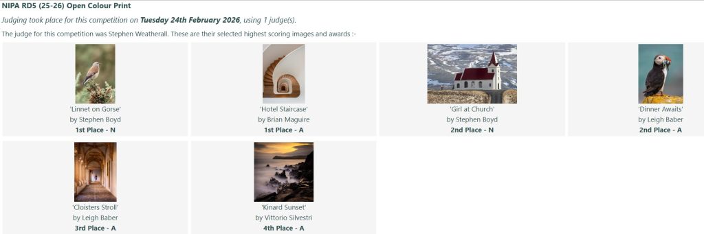 On Tuesday 24th February, we had the fifth round of the NIPA Inter-Club Competition judged at the club, by BPIC member, Stephen Weatherall.